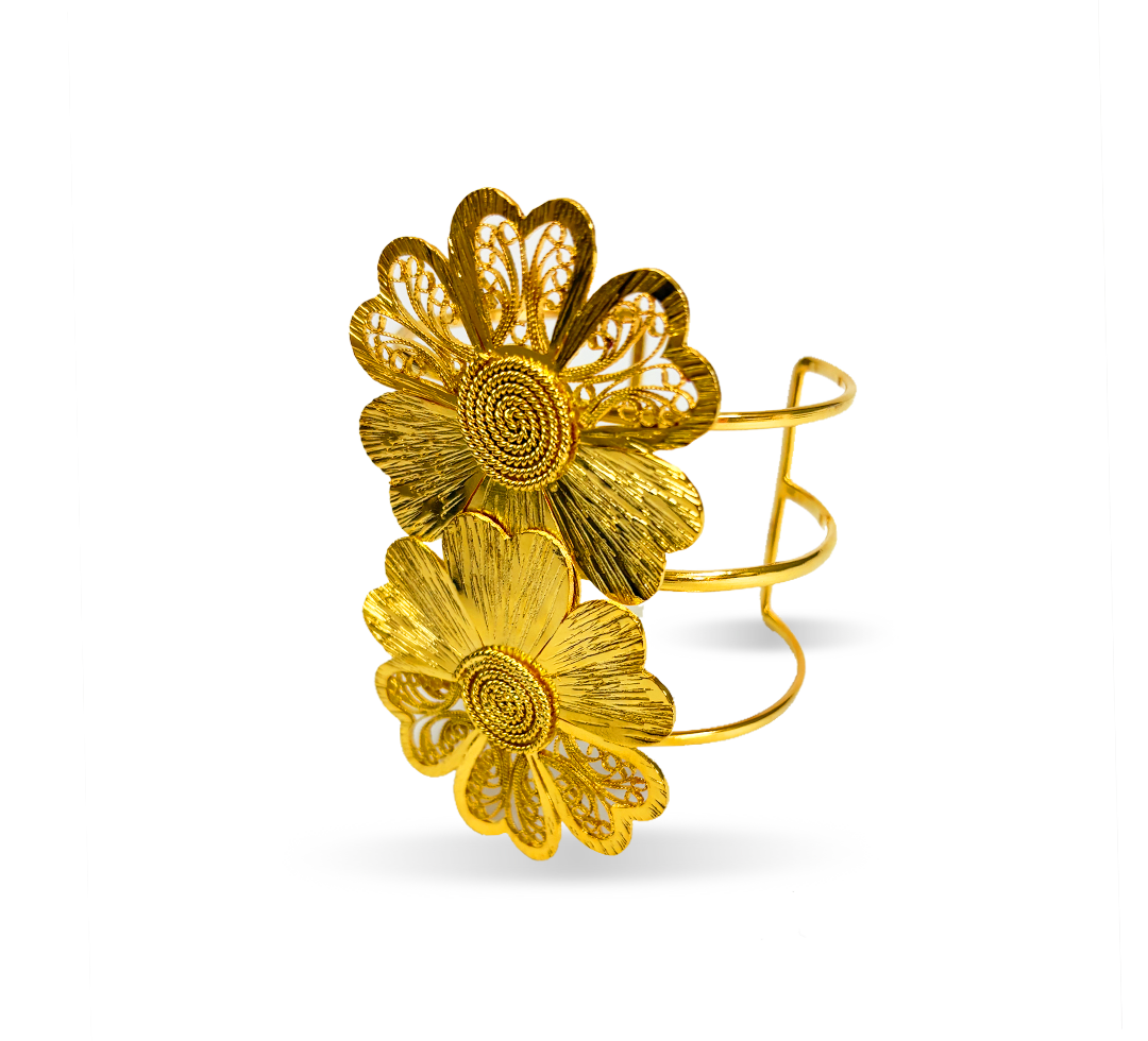 Double flower bracelet crafted using a cut-out and filigree technique in bronze and copper with 24k gold plating.The flowers represent the earth element and a woman’s sensitivity.