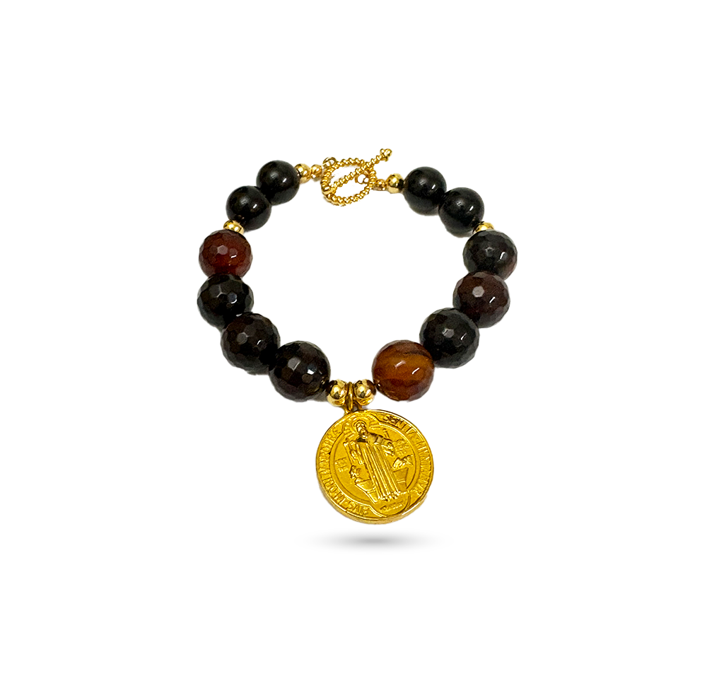 This bracelet features agate stone (known for enhancing concentration and calmness) with a St. Benedict medal pendant, beautifully plated in 24k gold.