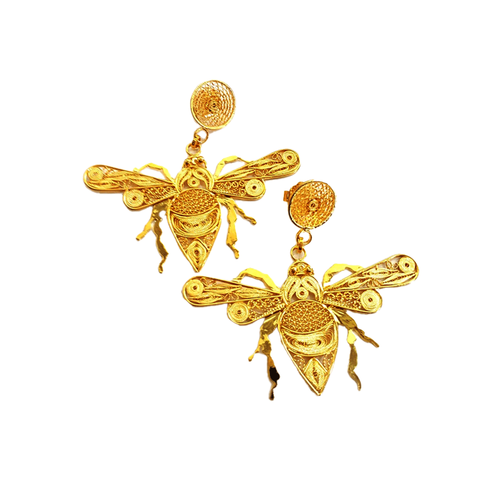 Bronze and copper, 24k gold plating. Bees woven in bronze and copper threads using handmade filigree technique.