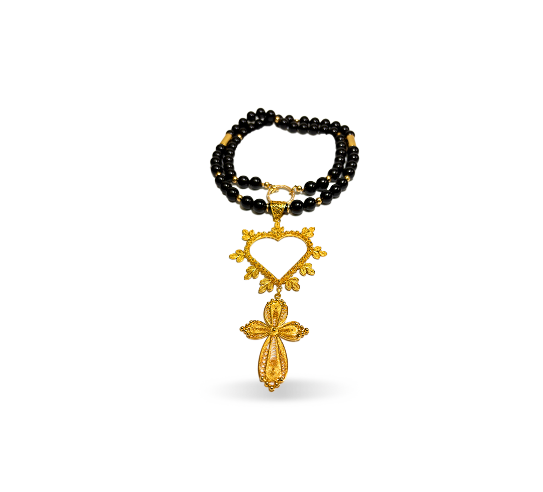 This necklace features black tourmaline (known for blocking negative energies) with a heart and cross pendant crafted in the delicate filigree technique from bronze and copper, beautifully plated in 24k gold.