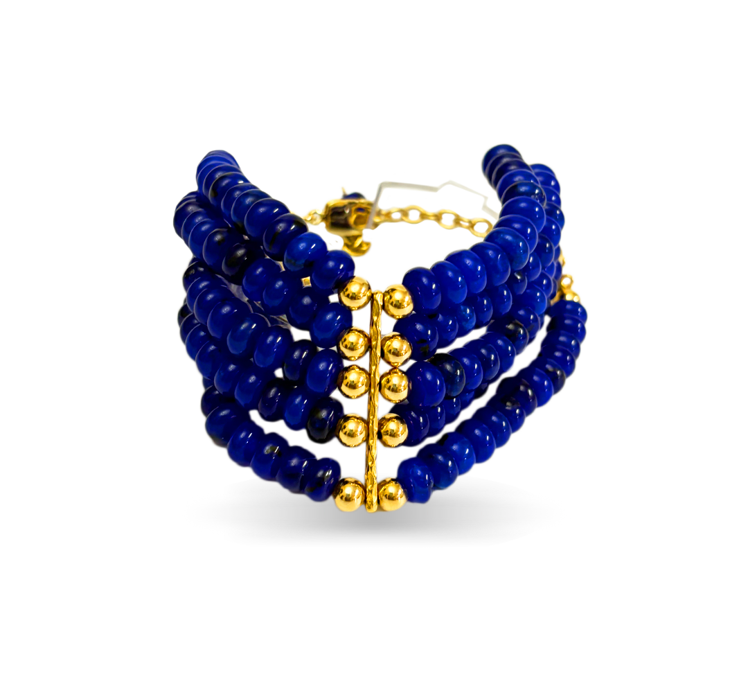 Bracelet with five turns of blue jade stone (a stone that reflects peace and reflection), with gold-plated ends.