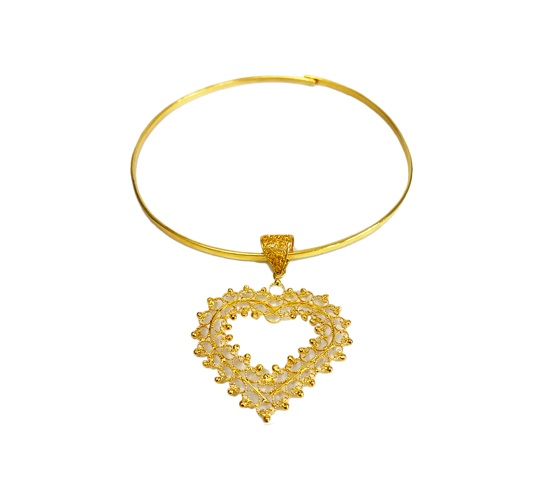 Choker with heart pendant and bead details, crafted using filigree technique in bronze and copper, plated with 24K gold.
